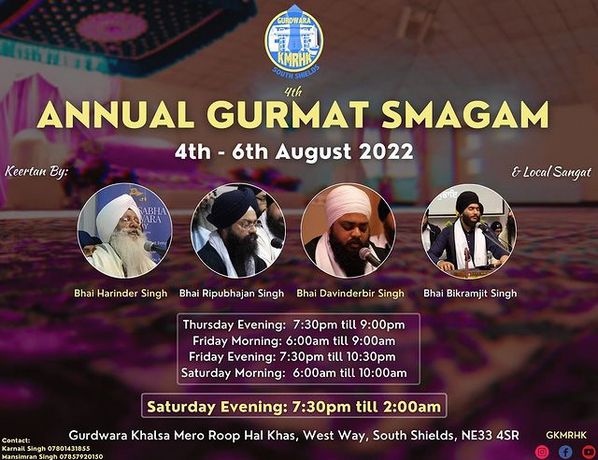 With Guru Sahibs blessings, Gurdwara Khalsa Mero Roop Hai Khaas humbly invites the saadhsagat to our Fourth Annual Gurmat Samagam, taking place between 4th – 6th August 2022.
